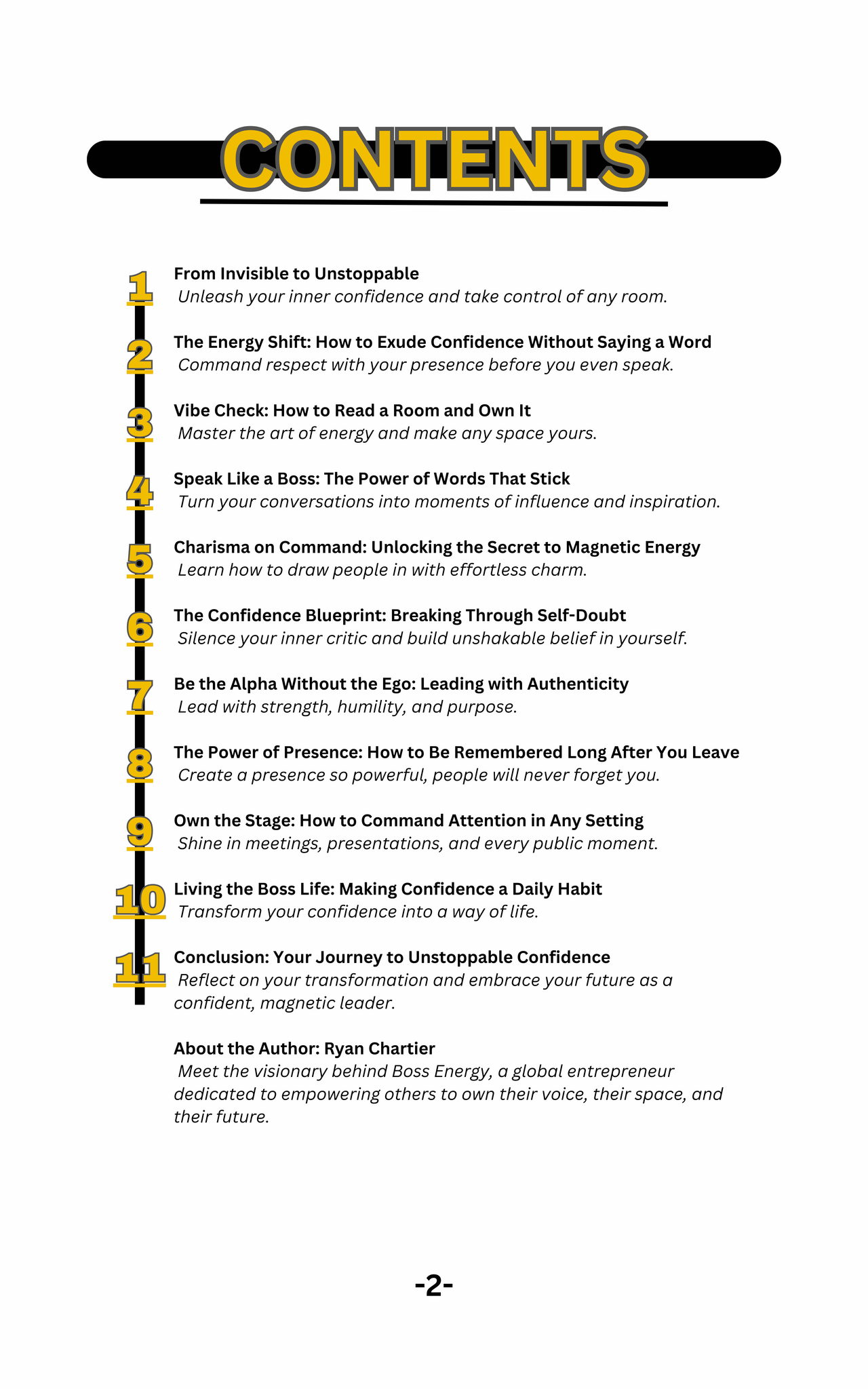 • Master Charisma and Presence: Develop magnetic energy that naturally draws people in and makes them eager to listen, connect, and follow your lead.