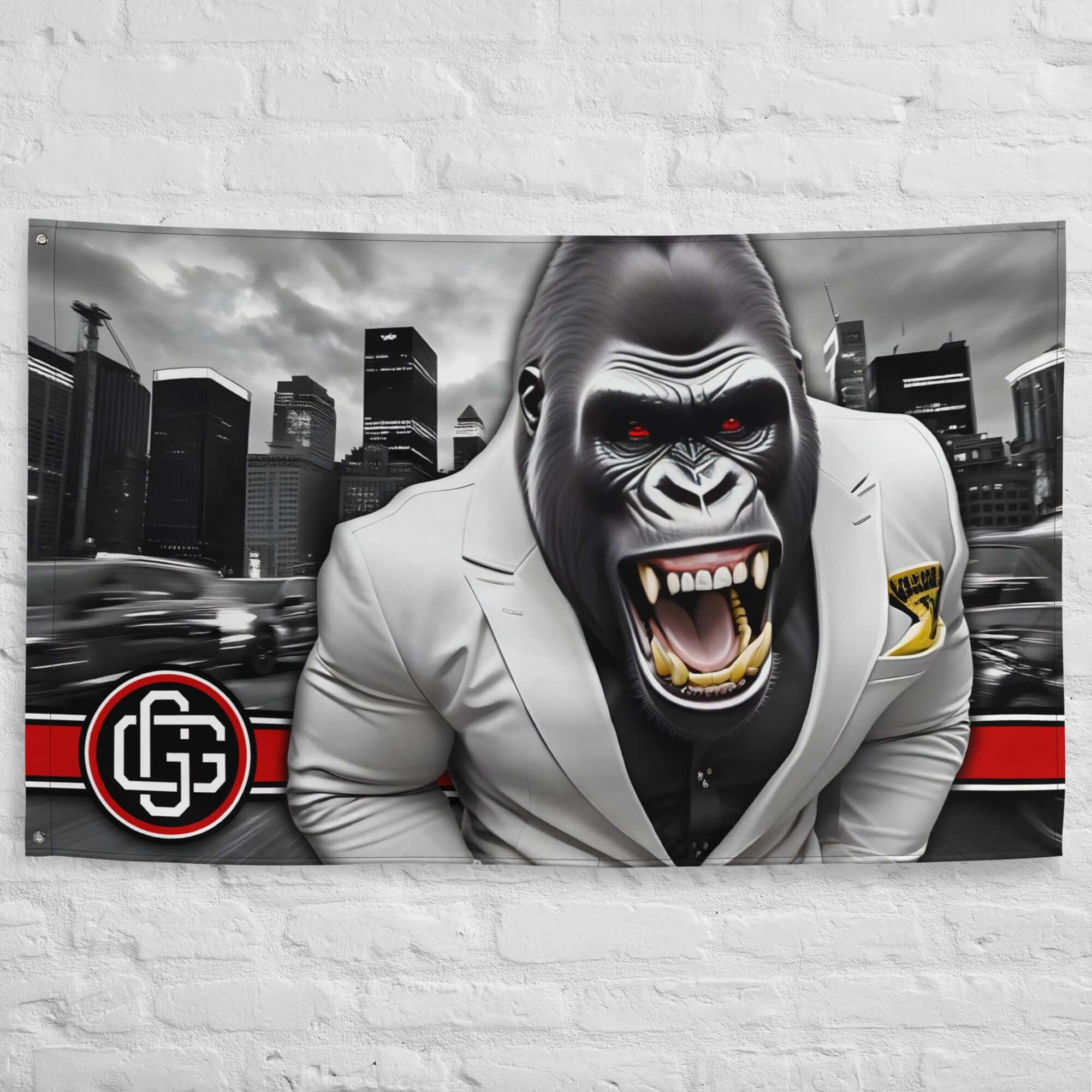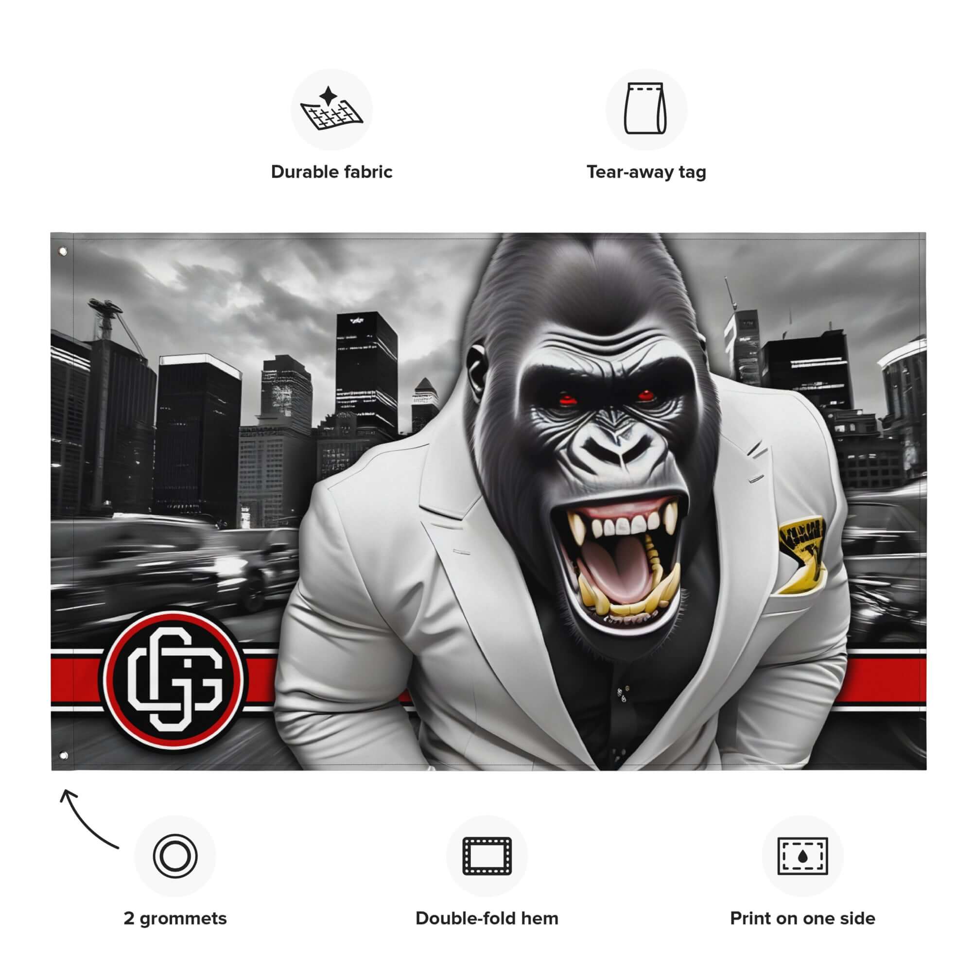 Crafted from lightweight but durable polyester, it hangs easy and holds strong. The one-sided print hits hard with bold detail, while the clean double-fold hem and solid iron grommets keep your banner flying — whether it’s in your gym, garage, bar, or inner sanctum of savage energy.